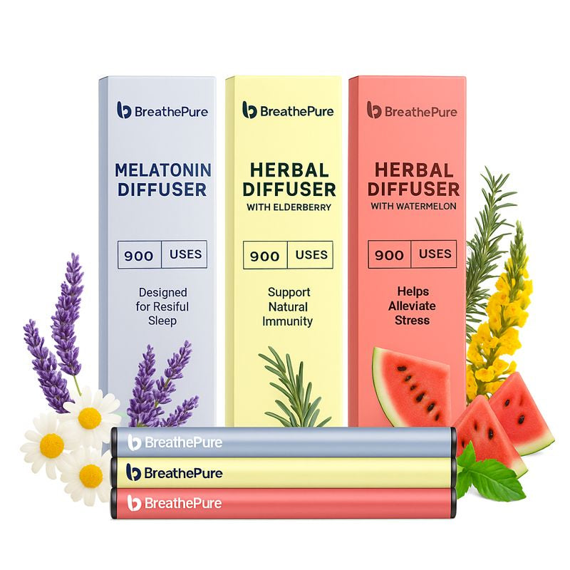 BreathePure herbal diffusers are crafted with natural plant-based extracts to support relaxation, clearer breathing, and restful sleep. Each variant delivers a smooth, nicotine-free experience designed for daily wellness and balance. A clean and calming alternative made to help you feel better, naturally.